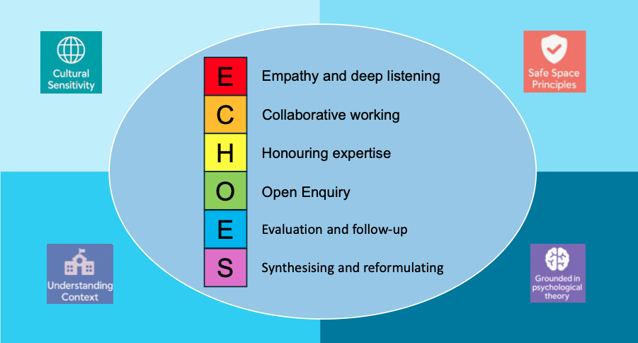 While the ECHOES acronym details the skills and tasks of consultation, the boxes around provide the broader practice philosophy. We are aiming for consultation to provide a safe, supportive space for consultees to share their concerns and work in partnership.